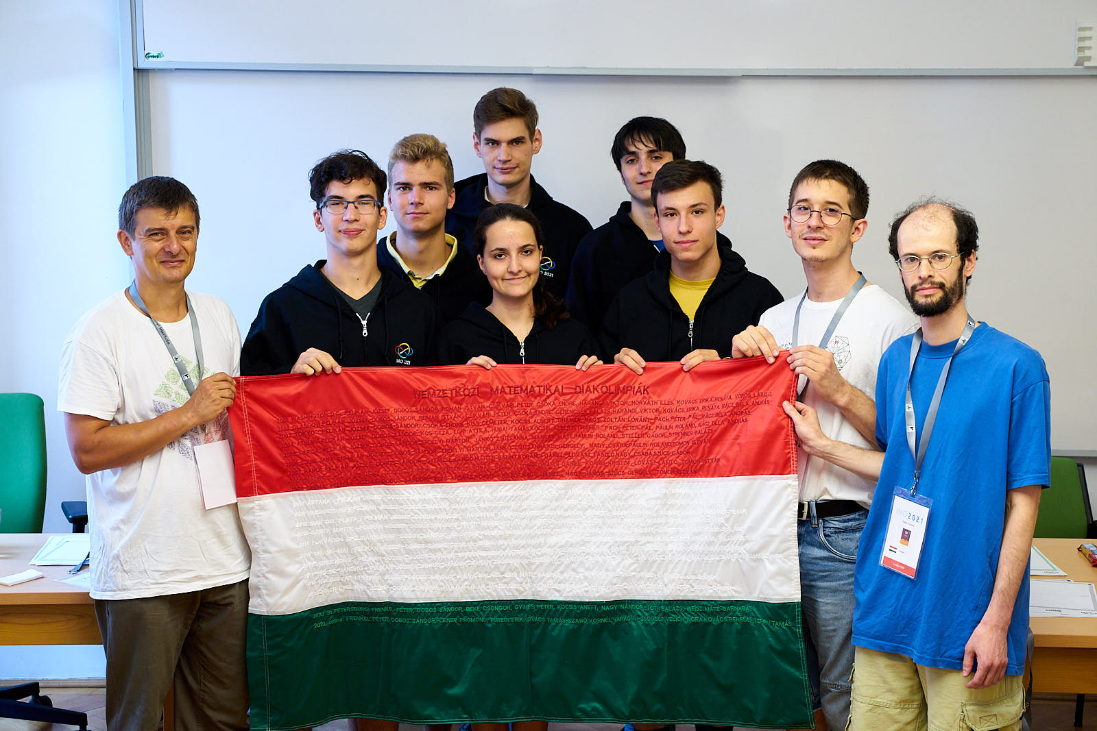 A csapat felkészítését Frenkel Péter (jobb szélen), a Rényi Matematikai Kutatóintézet tudományos munkatársa és Dobos Sándor (bal szélen), a Budapesti Fazekas Mihály Gyakorló Általános Iskola és Gimnázium tanára vezette. Kovács Benedek (az egyik hivatalos megfigyelő) jobbról második.