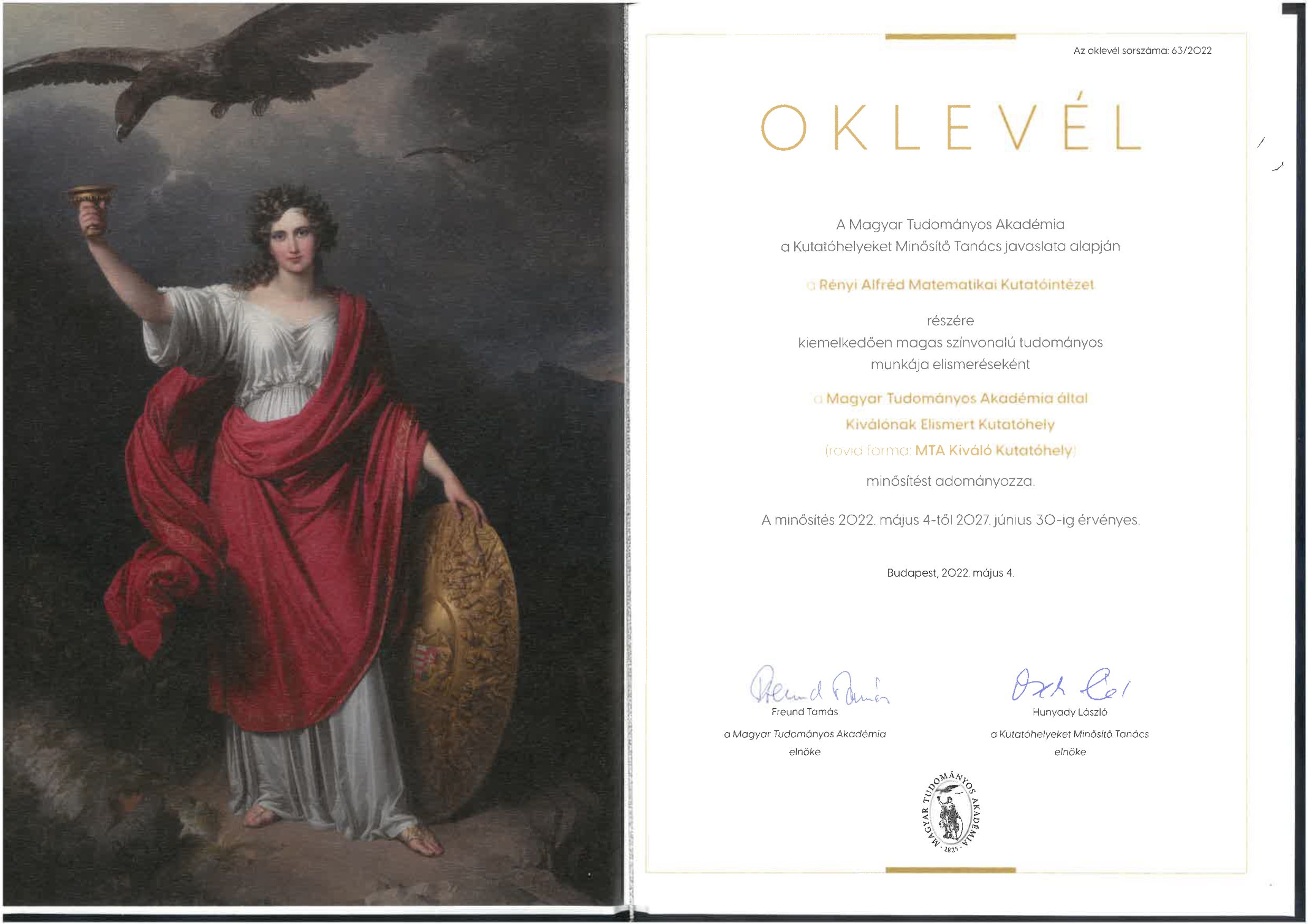 A Magyar Tudományos Akadémia a Kutatóhelyeket Minősítő Tanács javaslata alapján kiemelkedően magas színvonalú tudományos munkája elismeréseként az MTA által Kiválónak Elismert Kutatóhely minősítést adományozta 95 magyarországi tudományos műhelynek és intézménynek. Az erről szóló okleveleket a Magyar Tudományos Akadémia Széchenyi téri székházában adták át május 4.-én ünnepélyes keretek között a rangos minősítést elnyert kutatóhelyek képviselőinek.